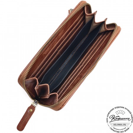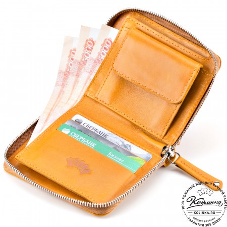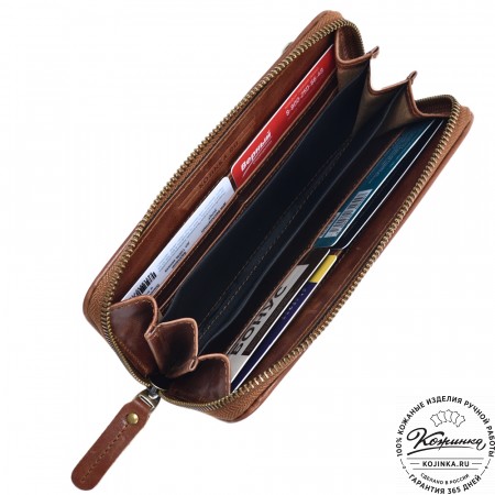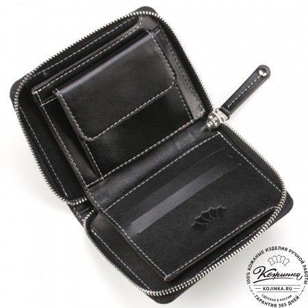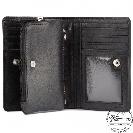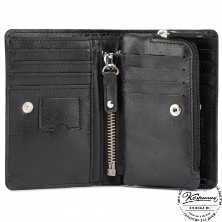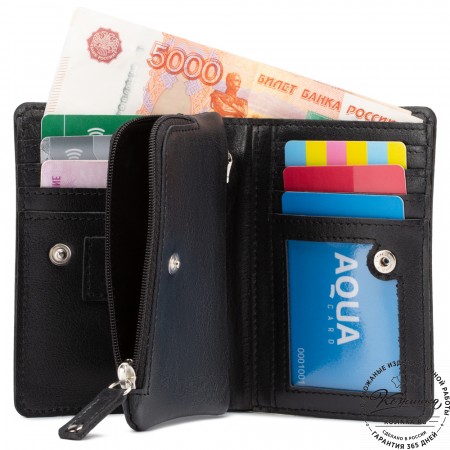Эта модель очень функциональна - множество отделений позволяет удобно расположить большое количество кредитных карт и купюр, а также водительское удостоверение. Дополнительный отсек для мелочи. Портмоне закрывается на язычок с кнопкой.