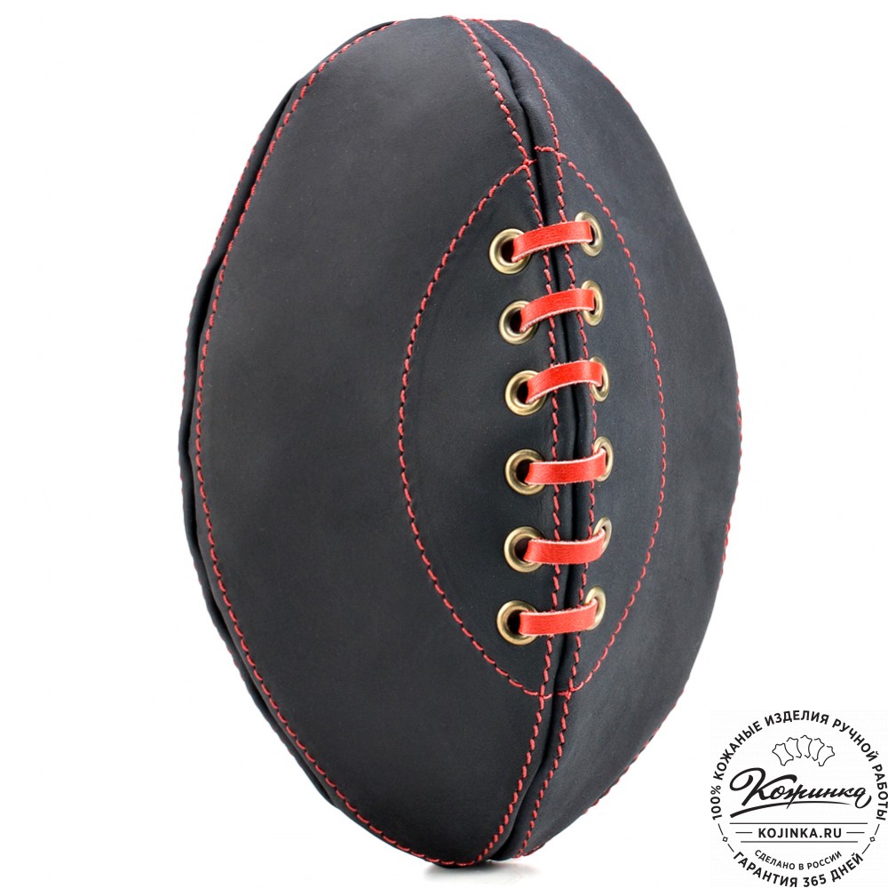 Выполнен в форме мяча для спортивной игры регби. Как и настоящий регбийный мяч, наш имеет 4 грани, сшитые крепкими нитями.