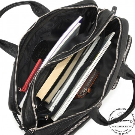 У сумки два автономных отделения под формат А4 и ноутбук с диагональю до 15,6" дюймов. Оба отделения закрываются на молнию.