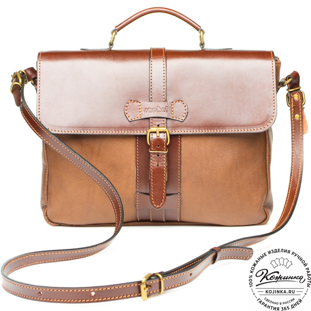 Портфель из 100% натуральной толстой кожи, закрывается на одну пряжку с регулируемой длиной. Сверху конструкция укреплена жёсткой толстой кожей. Внутри два удобных отдела разделённых перегородкой с карманом на молнии. В переднем отделении есть дополнительный малый карман на молнии. На задней стенке имеется один накладной кожаный карман и второй карман на молнии - для быстрого доступа.