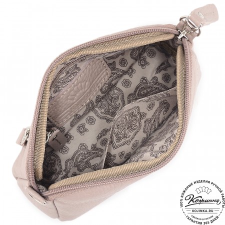 У сумочки одно отделение, куда поместятся самые необходимые вещи – телефон, ключи, документы и кое-что из косметики. Внутри есть небольшой открытый кармашек.