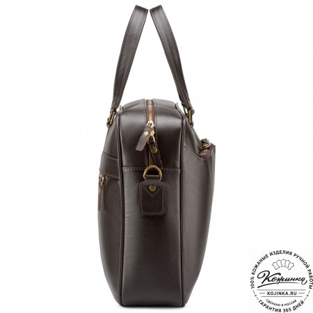 У портфеля прочная удобная ручка и кожаный плечевой ремень. Ремень съемный, крепится по бокам на небольшие карабины, регулируется по длине ременной пряжкой. Свободный конец ремня аккуратно фиксируется кожаным кольцом.