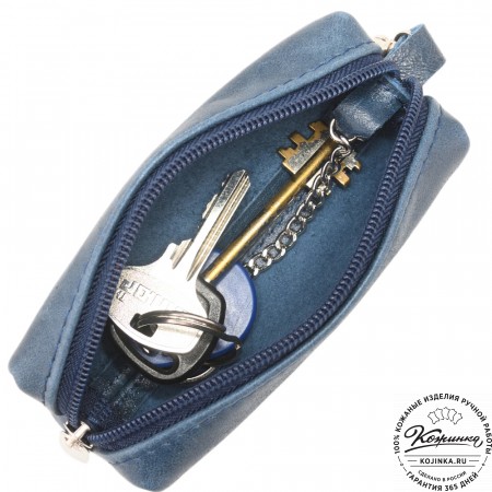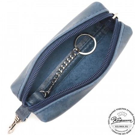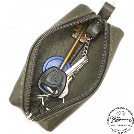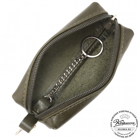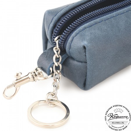 Внутри на кожаных петлях расположены металлическое кольцо для ключей и небольшой металлический карабин.